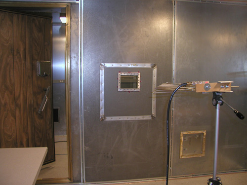 The photograph below (Figure1.) shows the test facility where "Shielding" conducts performance measurements to determine the shielding effectiveness (SE) of it's products. This shielded room is a Modular-Cell Type Radio Frequency (RF) Shielded Enclosure manufactured by Lindgren RF Enclosures Inc. and is located on the factory floor at Shielding Express Inc. in Taunton, MA. It is a nominal 12' X 18' X 8' unit and includes two 3' X 7' Double-Knife-Edge (DKE) doors. Externally this room stands as it would be installed by Lindgren with one of the doors providing access as shown in the figure. Internally it has been modified to accommodate a partition-wall that separates the inside of the room into two compartments. As indicated in the photograph, Figure 2, the partition-wall includes the second 3' X 7' DKE door and a test window to permit shielding effectiveness tests on shielded windows and other RF gasket products. In use for testing purposes, this arrangement permits a transmitter to be located in one of the compartments and a receiver in the other compartment.
